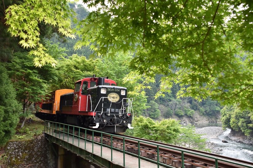 ノスタルジックな雰囲気の車両と四季折々の保津川渓谷の風景が楽しめることで人気のトロッコ列車。